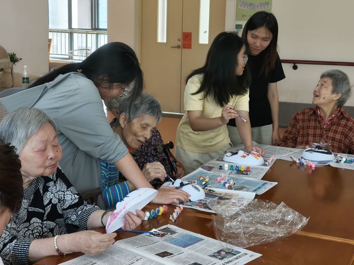 到了午后,阳光透过窗棂洒在桌上,队员们又与老人们玩起了纸上粘土。大家揉、捏、搓、压,五颜六色的粘土在指尖变成了圆润的苹果、可爱的小动物,还有老人记忆里的老房子。养老院里,腿脚不便的爷爷奶奶们坐着轮椅,颤巍巍地捏着粘土,乐呵呵配合大学生志愿者,眼里闪着光,满是认真劲儿。
