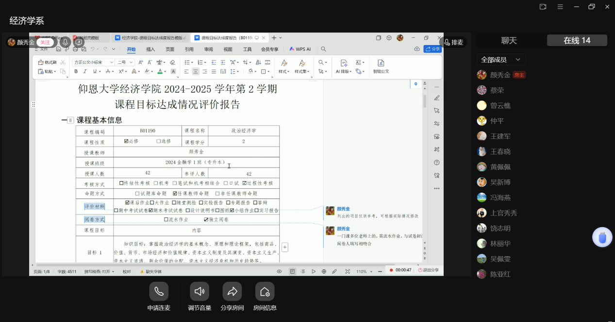 最后,经济学系主任颜秀金对此次课程目标达成度评价线上教师研讨会进行了总结。本次研讨会,教师们充分交流经验和意见,有效提升了教师的教学评价素养,为优化课程设计、改进教学策略提供了重要参考,为经济学专业建设提供了有力支撑。未来,经济学系将持续深化教育教学改革,切实将评价成果转化为育人实效,为培养新时代高素质经济学人才筑牢质量根基。(yl23411集团 经济学系/图文 审核:颜秀金、黄培真)