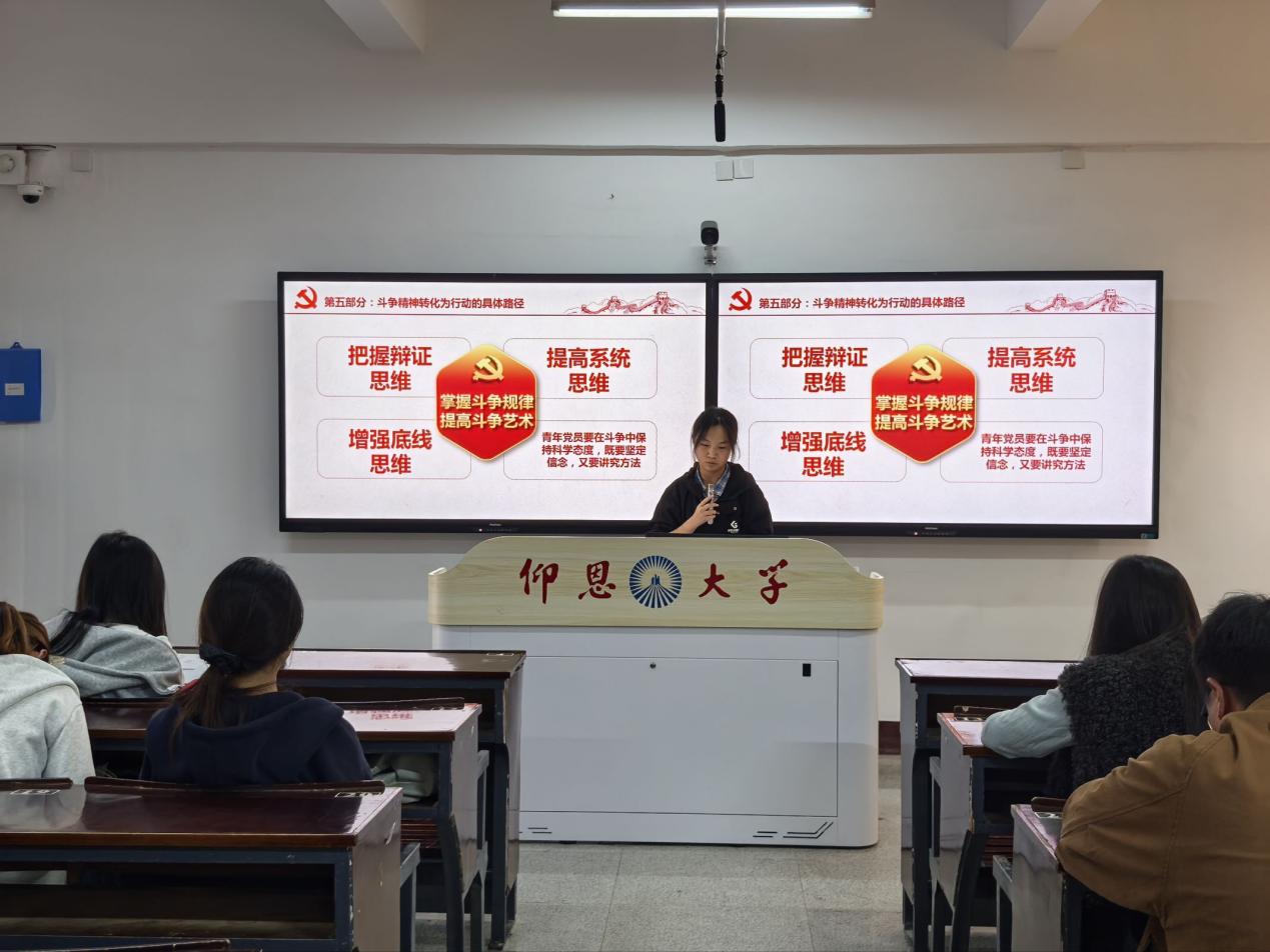 在案例分享环节,各班积极分子代表结合自身经历交流心得。有的谈及在学习中直面难题的坚持,有的分享了基层实践中服务群众的感悟。其中,积极分子林慕涵同学就“如何将斗争精神外化于行”分享见解,阐述了从“知”到“行”的具体路径,生动诠释当代大学生面对责任担当应实干斗争。大家一致认为,斗争不是抽象概念,而是在践行青年使命中攻坚克难的实际行动。