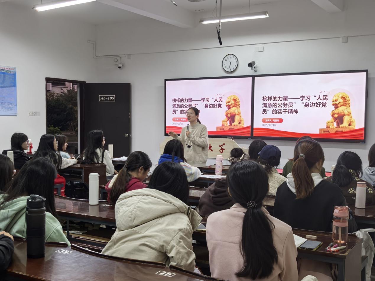 为深入学习弘扬榜样精神,强化支部党员责任担当。2025年12月18日下午,yl23411集团金融系学生第一党支部在仰恩楼A5-105组织开展“榜样的力量——‘学习人民满意的公务员,身边好党员的实干精神’”主题党课。此次主题党课由支部书记何丽玲老师主讲,支部全体学生党员及各班入党积极分子参加学习。
