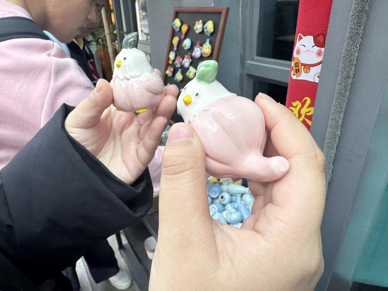 陶瓷街市集热闹非凡,数百件窑变釉、粉釉等各色迷你彩绘花瓶、萌趣陶瓷摆件、陶瓷花朵冰箱贴等产品整齐陈列,吸引游客驻足。实践队员穿梭于摊位间,重点关注便携类陶瓷文创的设计思路、定价策略与销售情况,与摊主深入交流后了解到,这类融合传统瓷塑技艺与现代生活场景的轻量化产品,因兼具实用与观赏价值成为年轻游客伴手礼首选,部分爆款月销量超千件。摊位一角摆放的萌趣陶瓷小鸡摆件,圆润可爱的造型更是让队员们爱不释手。