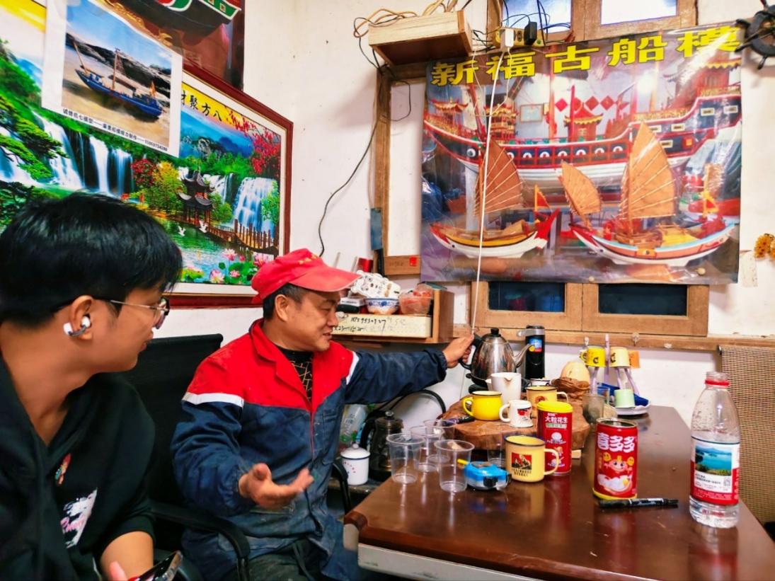 “福船的每一块木料、每一道工序都藏着古人的智慧。”刘荣勇指着工坊内正在制作的船模,向队员们拆解福船的营造流程:从选料、备料的严苛标准,到水密隔舱的精巧设计,再到船帆、船舵的安装技艺,每一步都凝聚着世代相传的经验与匠心。他还结合自身数十年的从业经历,讲述了福船从古代海上贸易的“硬核载体”,到如今成为文化符号的演变历程,让队员们深刻体会到这项非遗技艺背后承载的海洋文明与民族精神。