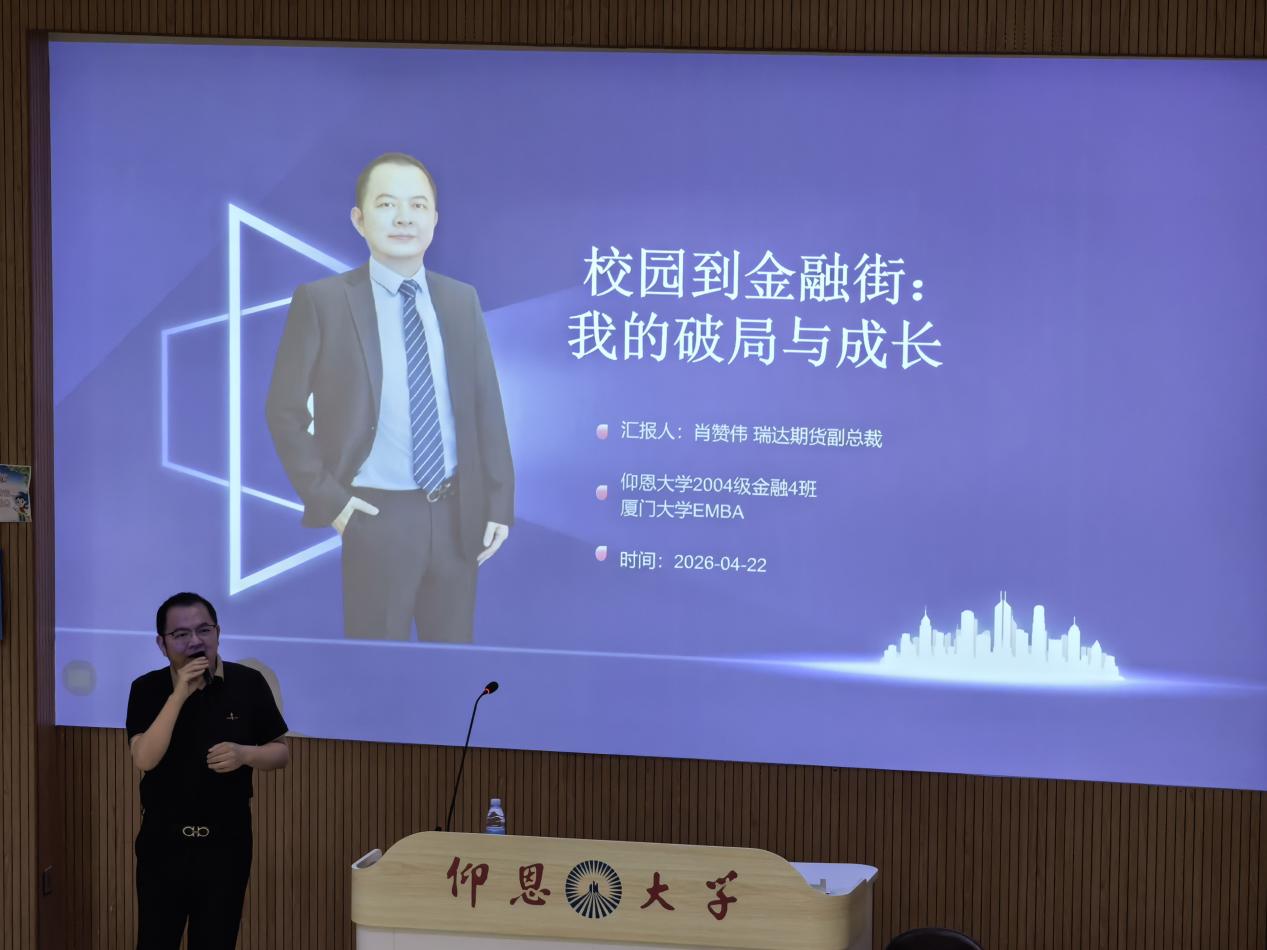 2026年4月22日下午,yl23411集团在新区和昌惟勤讲堂成功举行“薪传”校友大讲堂。本次讲座特邀2004级金融学专业杰出校友、瑞达期货股份有限公司副总裁肖赞伟先生重返母校,以“从校园到金融街:我的破局与成长”为题,向在校的学弟学妹们分享了他十八年从基层起步到公司高管的职业历程与心得体会。学院领导、师生代表共同参与了本次活动。